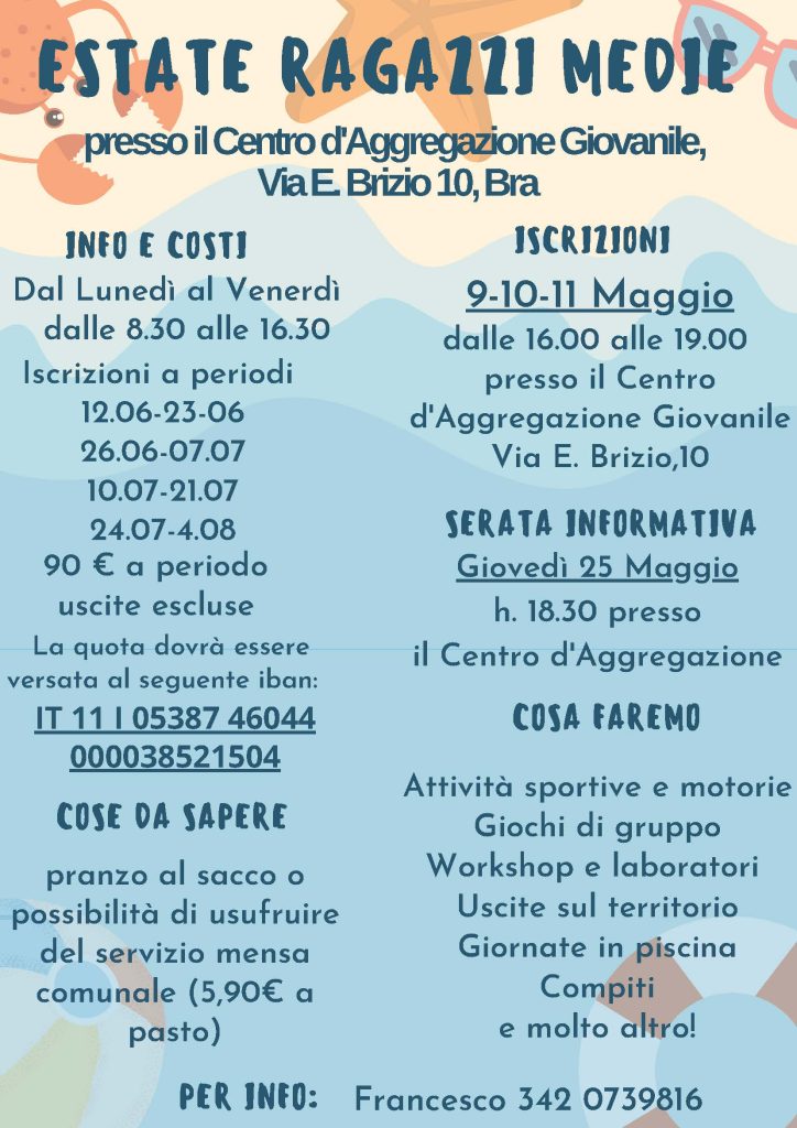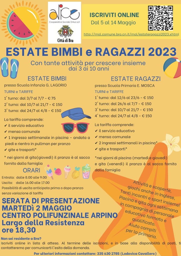 • per infanzia e primaria: iscrizioni on line dal 5 al 14 maggio 2023 a questo link: http://mol.comune.bra.cn.it/mol/estateragazzi2022.xhtml;