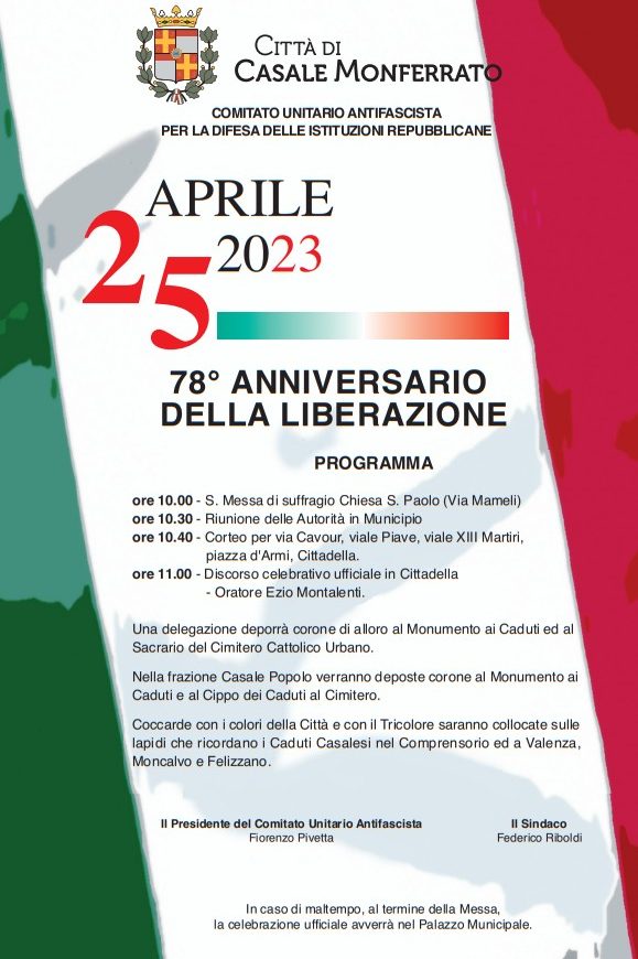 Martedì 25 aprile in occasione del 78° anniversario della Liberazione, il Comune di Casale Monferrato con il Comitato Unitario Antifascista celebrerà la ricorrenza a partire dalle ore 10.00 con la S. Messa di suffragio presso la Chiesa di S. Paolo, in Via Mameli; a seguire, alle ore 10.30, si terrà la riunione delle Autorità in Municipio e alle 10.40 partirà il corteo Corteo per via Cavour, viale Piave, viale XIII Martiri, piazza d’Armi, Cittadella. Alle ore 11.00 si terrà il discorso celebrativo ufficiale in Cittadella: oratore sarà Ezio Montalenti.
