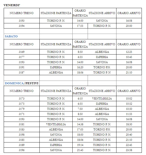 Dal prossimo fine settimana e fino al 10 settembre, tutti i weekend e i giorni festivi saranno attivi 18 treni in più collegheranno il Piemonte alla riviera ligure di Ponente mettendo a disposizione oltre 23mila posti in più.