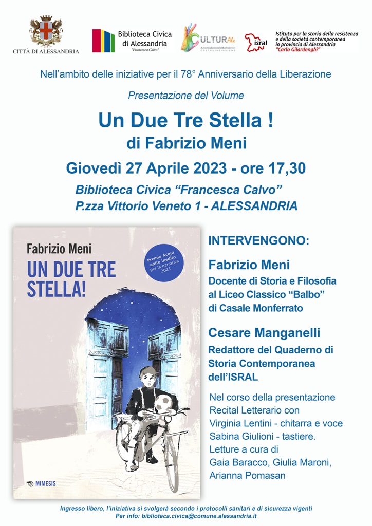 Nell’ambito delle iniziative cittadine per il 78° Anniversario della Liberazione, giovedì 27 aprile alle ore 17,30 presso la Biblioteca Civica “Francesca Calvo” di P.zza Vittorio Veneto 1 ad Alessandria, si terrà la presentazione del volume UN DUE TRE STELLA! di Fabrizio Meni, insegnante di filosofia e storia al Liceo Classico “Balbo” di Casale Monferrato, ricercatore presso l’ISRAL e redattore della rivista “Quaderno di storia contemporanea”.