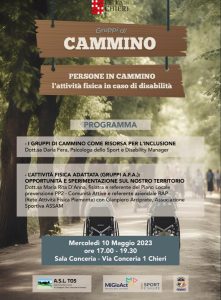 Questo il programma dell’incontro del 10 maggio (ingresso libero): “I Gruppi di Cammino come risorsa per l’inclusione” (Dott.sa Daria Fera, Psicologa dello Sport e Disability Manager); “L’attività fisica adattata (Gruppi A.F.A.): opportunità e sperimentazione sul nostro territorio” (Dott.sa Maria Rita D’Anna, fisiatra e referente del Piano Locale prevenzione PP2-Comunità Attive e referente aziendale RAP-Rete Attività Fisica Piemonte con Gianpiero Arciprete, Associazione Sportiva ASSAM).