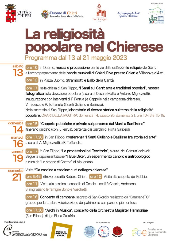 La settimana si apre sabato 13 maggio, alle ore 10, con la Messa in Duomo e la Processione dei Santi Giuliano e Basilissa (piazza Duomo, via XX Settembre, via San Domenico, via Vittorio Emanuele II, via Palazzo di Città, via Cottolengo, via Balbo, piazza Duomo) con l’accompagnamento musicale dalla Filarmonica Chierese e delle bande di Riva presso Chieri e di Villanova d’Asti, cui seguiranno la recita degli “strambotti” e il “Ballo delle Carità” in piazza Duomo; e si conclude domenica 21 maggio con il concerto di campane sul sagrato della chiesa di San Giorgio, alle ore 16, a cura di CampaneTO, gruppo per la tutela e la valorizzazione del patrimonio campanario piemontese, mentre alle 17,30, alla chiesa di San Filippo, è previsto il concerto “Archi in Musica” della Orchestra Magister Harmoniae.