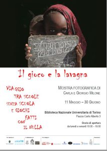 Mostra fotografica di Carla e Giorgio Milone La Mostra: IL GIOCO E LA LAVAGNA – Fotografie di Carla e Giorgio Milone Luogo: Biblioteca Nazionale Universitaria di Torino, piazza Carlo Alberto 3 – Torino Periodo: 11 maggio – 30 Giugno 2023 Orario: lunedì-venerdì – 10.00-16:00