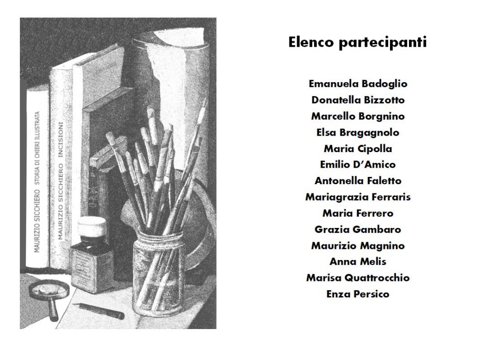 Artisti: Natalia ALEMANNO, Mirco ANDREIS, Dario BATTAGLIÒ,Giulio BENEDETTI, Maria Rosa BENSO, Barbara BORINI, Erica CATAPANE, Vincenzo CEPPA, Anna Maria CERVELLERA, Giuseppe D’ANTONIO, Roberto DAVICO, Cristina DE MARIA, Lidia DELLOSTE, Pierangelo DEVECCHI, Sergio DEVECCHI, Giuseppe FARETINA, Franco FASANO, Claudio FASSIO,         Grazietta GARZENA,  Giancarlo Aleardo GASPARINI, Monica GROSSI, Daniela LIGNANA, Diletta LO GUZZO, Marisa MANIS, Adelma MAPELLI, Immacolata MARTINA, Delio MEINARDI, Giuseppina NAPOLI, Anna Maria PALUMBO, Claudio PEPINO, Evangelista RINALDI, Alberto ROSSI, Ambretta ROSSI, Paola ROSSI, Antonio RUSSI, Giacomo SAMPIERI, Rita SCOTELLARO, Magda TARDON, Simone TROTTA, Loredana ZUCCA