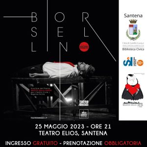 In occasione della Giornata della Legalità la Biblioteca Civica di Santena propone lo spettacolo di Teatro Civile del Teatro Bresci: Borsellino. Si terrà Giovedì 25 Maggio, alle ore 21, presso il Teatro Elios, a Santena. L’ingresso è gratuito, ma occorre obbligatoriamente prenotarsi presso la Biblioteca di Santena (3450785540 / bibliotecasantena@gmail.com).