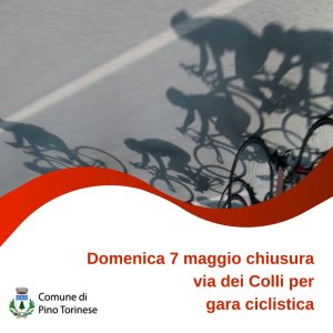 Domenica 7 maggio si terrà la gara ciclistica di granfondo Briko Torino, un percorso ad anello di 114 km e più di 2.000 m di dislivello che tocca 22 comuni. La gara interesserà marginalmente anche il Comune di Pino Torinese, passando per Valle Ceppi e arrivando alla panoramica. Al fine di garantire l’incolumità dei partecipanti, via dei Colli rimarrà chiusa dall’incrocio con strada Palucco dalle ore 10 alle ore 13.45.