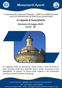 I volontari dell’associazione Carreum Potentia – ODV vi aspettano domenica 14 maggio, ore 15–18, per la rassegna “Monumenti Aperti 2023”. Sulla cresta di una collina si staglia la cappella rurale di Sant’Irene, conosciuta come Superghetta in quanto la forma evoca la vicina basilica diSuperga, costruita tra gli anni 1859-1860. Per l’occasione la nostra ODV collaborerà con la Confraternita di Sant’Irene, che custodisce dal 2008 il monumento. Si può raggiungere la cappella in macchina (da strada Valle Pasano e poi strada Sant’Irene) o a piedi (passeggiando lungo strada vicinale della Serra).L’evento è gratuito, per ulteriori informazioni: 333-1186114 o 335-7053523. Il prossimoappuntamento si terrà durante la manifestazione Di Freisa in Freisa del 21 maggio. Per ulteriori informazioni e per il calendario delle prossime attività consultare il sito www.carreumpotentia.it