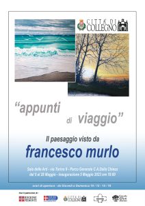 Alla Sala delle Arti di Collegno il pittore Francesco Murlo espone, sino al 28 maggio, una serie di “Appunti di viaggio”, che raccontano del suo incontro con la natura e un paesaggio risolto con un clima di intima poesia. La mostra è stata realizzata dalla Città di Collegno, in collaborazione con il Circolo degli Artisti di Torino, e il patrocinio della Regione Piemonte.