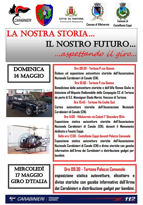 A Tortona iniziative in occasione del passaggio del Giro d’Italia con esposizione di autovetture storiche dell’Associazione Nazionale Carabinieri di Canale.