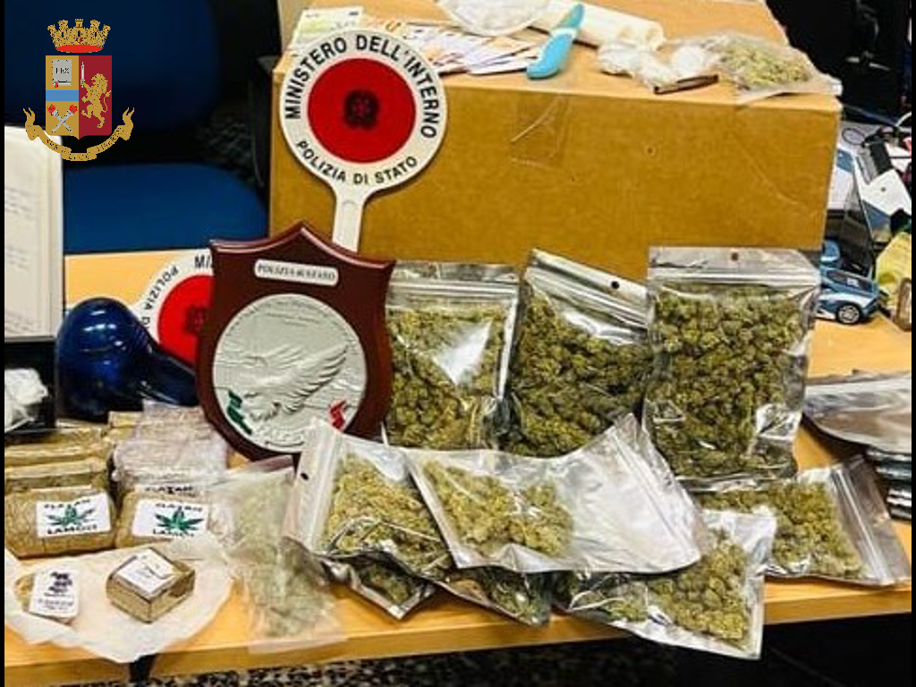 Nel pomeriggio di ieri, durante un mirato servizio antidroga della Polizia di Stato, i “Falchi” della Squadra Mobile procedevano al fermo di due giovani italiani, che viaggiavano a bordo di uno scooter, sospettati di effettuare consegne di droga. All’atto del controllo, il passeggero veniva trovato in possesso di hashish e marijuana nonché di alcune mazzette di banconote, delle quali non forniva spiegazioni circa la provenienza. I due giovani, che manifestavano un atteggiamento preoccupato e reticente, venivano condotti in Questura per gli ulteriori approfondimenti investigativi. Gli stessi consentivano di individuare i luoghi di rispettiva dimora, che i due si ostinavano a non comunicare.