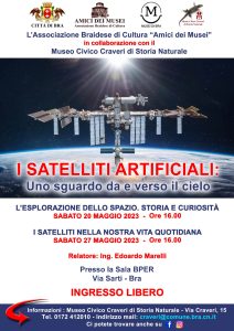Il 20 e 27 maggio l’Associazione Amici dei Musei di Bra, in collaborazione con il Museo Civico Craveri di Storia Naturale, organizza un breve ciclo di conferenze dal titolo I satelliti artificiali: uno sguardo da e verso il cielo a cura di Edoardo Marelli.