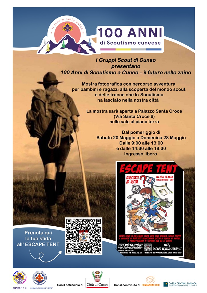 La mostra “100 Anni di Scoutismo a Cuneo – il futuro nello zaino” nasce nell’ambito delle celebrazioni per i 100 anni della fondazione del movimento scout a Cuneo, è organizzata con il patrocinio del Comune di Cuneo ed è promossa dai due Gruppi Scout Agesci (Associazione Guide e Scout Cattolici Italiani) di Cuneo (Cuneo 17 e 3), dalla Comunità Masci (Movimento Adulti Scout Cattolici Italiani) e da un gruppo di volontari che hanno vissuto lo scoutismo dagli anni ‘70 ad oggi.