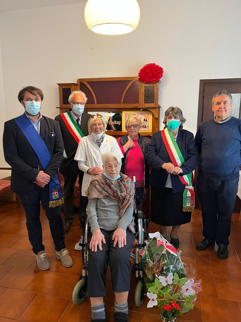 Nella foto con la neocentenaria, le autorità, una operatrice della struttura e il parroco.