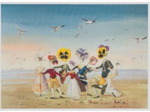 La metamorfosi dei volti dei suoi personaggi in colorati fiori venne costantemente perseguita come personalissima cifra stilistica riscontrabile anche nell’opera qui presentata; quale omaggio al capolavoro di Francisco Goya del 1789 conservato a Madrid.