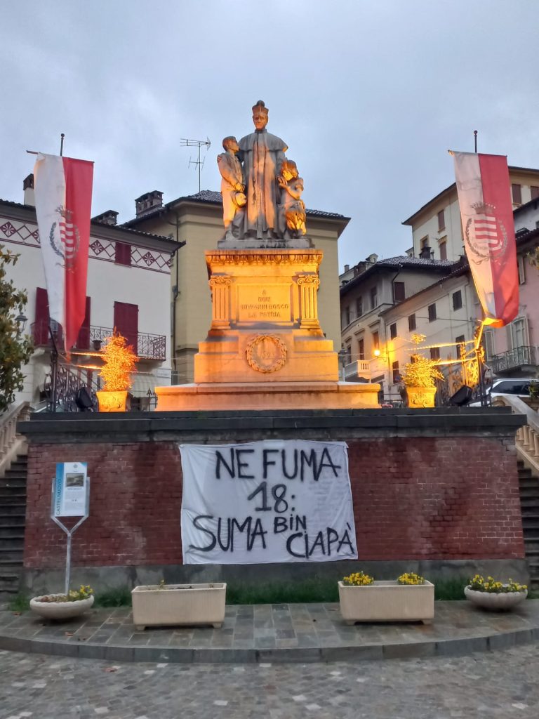 La foto arriva da un lettore di Castelnuovo, spiacevolmente colpito dalla scelta di mettere uno striscione sotto il monumento a Don Bosco…