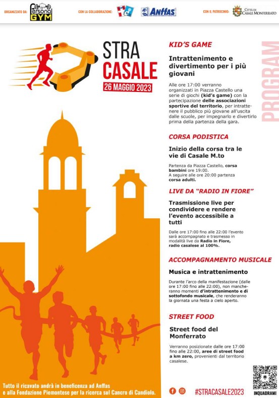 Il 26 maggio riprende la Stracasale 2023 la sentita corsa per le vie della città, con partenza e arrivo da piazza Castello, si terrà la quarantunesima edizione della Stracasale, gara non competitiva di beneficenza a sostegno di Anffas e della Fondazione piemontese per la ricerca sul Cancro (Candiolo) organizzata da Personal Gym SSD con la collaborazione della Città di Casale Monferrato.