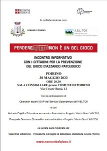 Si terrà il prossimo 30 maggio, nella Sala del Consiglio Comunale di Poirino (via Cesare Rossi 12) la prossima tappa del “Gap Tour” con il progetto “Vite in gioco per contrastare il fenomeno del gioco d’azzardo patologico.
