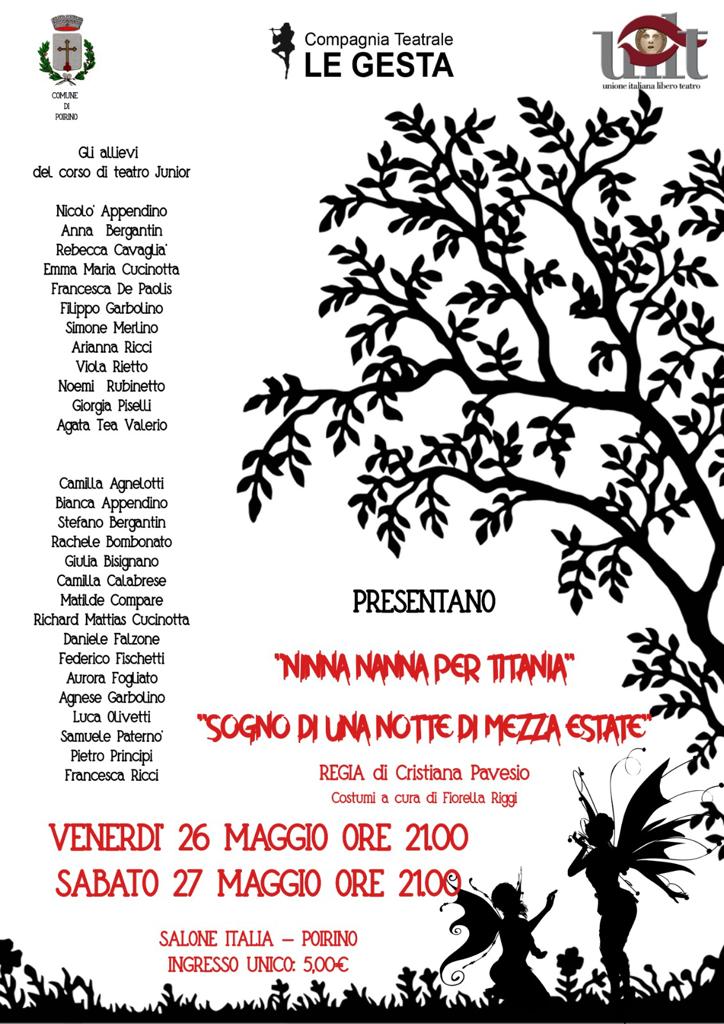 Il Sogno di una notte di mezza estate racconta delle imminenti nozze tra Teseo, duca d’Atene, e Ippolita, regina delle Amazzoni, da lui sconfitta e suo bottino di guerra. Un gruppo di artigiani-attori prepara una recita per l’occasione, mentre Titania e Oberon, rispettivamente regina e re delle fate, presumibilmente protettori dei talami nuziali, sono in lite fra loro e assistono nel bosco, tra un dispetto e l’altro, all’incontro tra amanti incompresi, amanti in fuga, amanti non corrisposto. Un fitto bosco di equivoci e malintesi, un re e una regina litigiosi, folletti dispettosi e creature magiche sono gli ingredienti ideali per una commedia divertente. Con il numeroso gruppo di giovani allievi, abbiamo provato a giocare con questa storia immortale, aggiungendo anche un prequel: Ninna Nanna per Titania messo in scena dai più piccini. Vi aspettiamo numerosissimi venerdì 26 e sabato 27 al Salone Italia alle ore 21.00. Per info e prenotazioni: tel. 3385266667- Whatsapp 3758073706. Biglietto unico 5€.