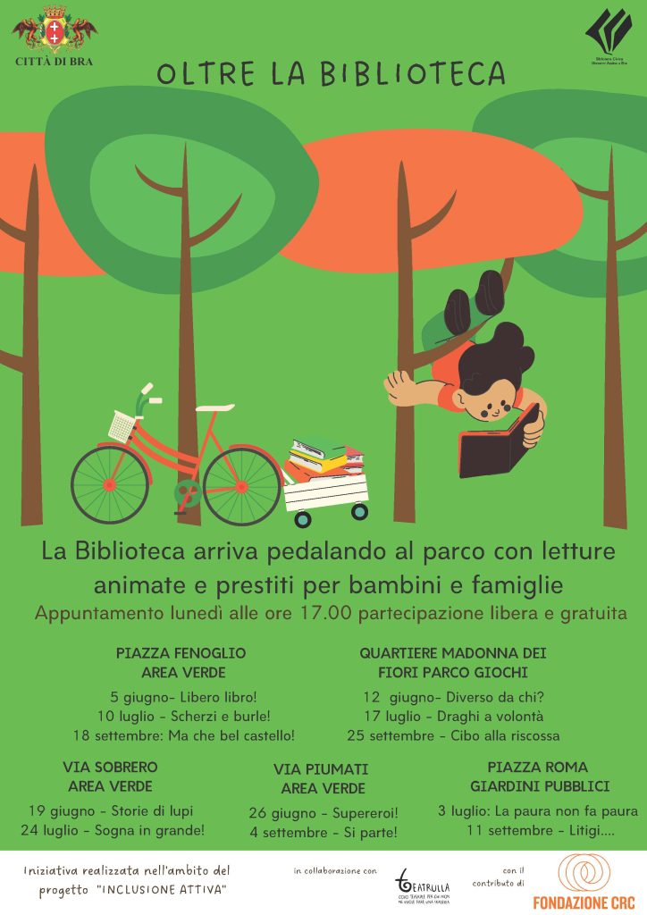 Con il mese di giugno e l’arrivo dell’estate a Bra si ripropongono le letture animate itineranti del progetto “Oltre la biblioteca”. Grazie alla bicicletta elettrica a pedalata assistita donata al Comune dall’Egea e al cassone mobile appositamente realizzato dagli studenti del Cnos Fap Salesiano collegato al mezzo, gli operatori della biblioteca civica “Giovanni Arpino”, affiancati dagli animatori dell’associazione Teatrulla e dai Nasi Rossi dell’associazione Arcobaleno V.I.P. (Viviamo in positivo), si sposteranno in vari punti della città per allietare i più piccoli (gli incontri sono dedicati in primis ai bambini dai 3 anni in su) con tante storie divertenti.
