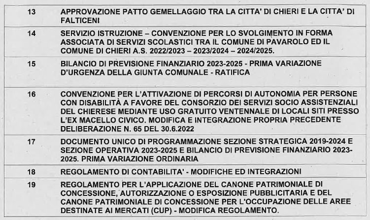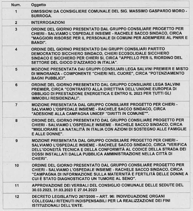 Chieri. Consiglio Comunale il 31 maggio e 1° giugno. L’ordine del giorno