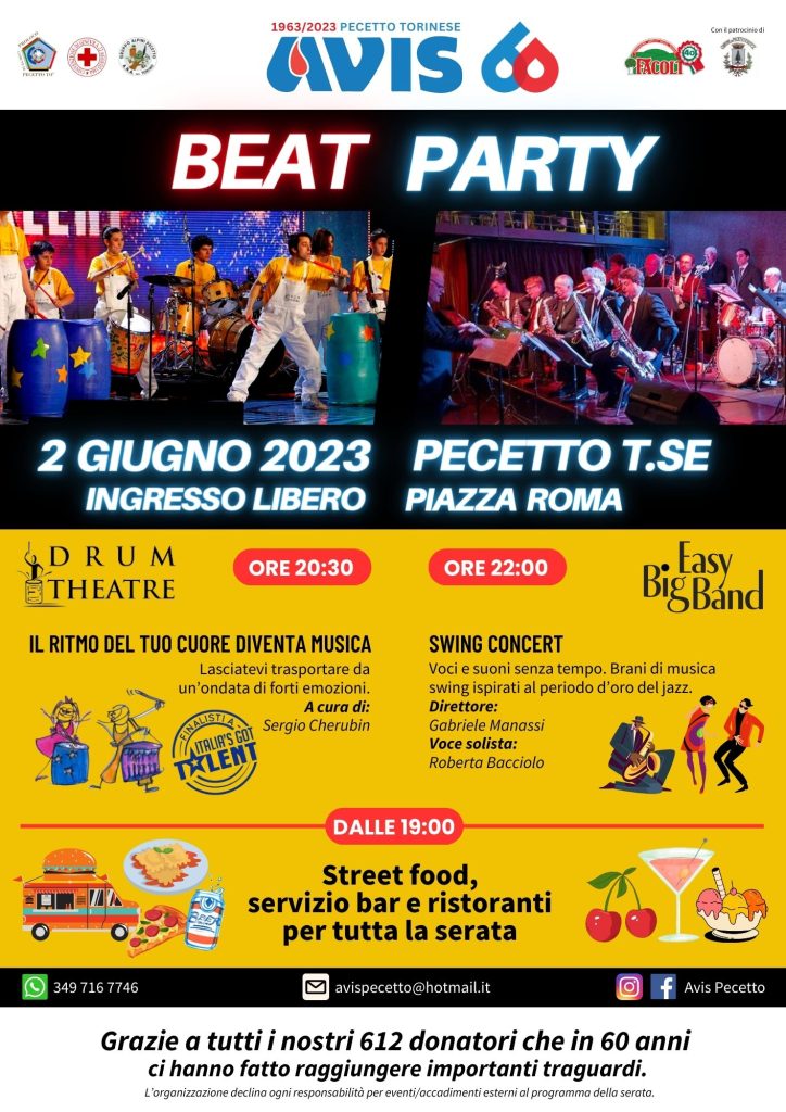 Nel corso di questi sessant’anni molto è cambiato, anche le attuali generazioni. In un mondo che cambia non si può restare immobili ma occorre seguire l’evoluzione dei costumi ed è per questo che per celebrare questo importante compleanno la festa, il 2 giugno, non sarà dedicata ai soli donatori come avveniva in passato, ma sarà una festa aperta a tutta la Comunità. E’ intitolata “Beat Party”. Una serata di musica in piazza Roma dove si esibiranno due band, i Drum Theatre, ragazzi Speciali che al battito (Beat) di tamburi e batterie sapranno creare emozioni indimenticabili, poi la Easy Big Band che si esibisce in uno Swing Concert. Serata da non perdere. Nel corso della serata che avrà inizio alle 20,30 il pubblico potrà ristorarsi con street food presso i ristoratori locali, presso un food truck e al chiosco dei gelati del Sermig, tutti partners di questa nostra bella iniziativa. Non mancheranno i produttori pecettesi con le loro succosissime e gustosissime ciliegie. Confidiamo che il pubblico partecipi numeroso per augurare ad AVIS Pecetto “BUON COMPLEANNO”