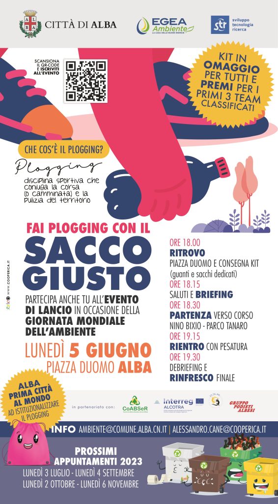 In occasione della Giornata Mondiale dell’Ambiente, ogni anno il 5 giugno, l’Amministrazione comunale di Alba, in collaborazione con Egea Ambiente, Società di Trattamento Rifiuti Str, in partenariato con Co.A.B.Se.R. Consorzio Albese Braidese Servizi Rifiuti, Interreg Alcotra e Gruppo Podisti Albesi, lancia l’albo dei plogger, fare sport e pulire l’ambiente mentre si cammina o si corre.