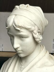 all’arricchimento del patrimonio artistico della Comunità di Poirino con l’opera di uno tra i più importanti artisti poirinesi del Primo Novecento”.Ma cos’è “La Primavera?” Rappresenta il busto di una giovane donna, con uno scialle ingentilito da decorazionifloreali, un Crocifisso, una folta capigliatura intrecciata e coperta da una cuffia. Forse è opera di fantasia, oppure un ritratto. Presumibilmente è stata realizzata all’inizio del Novecento. Sul lato posteriore del collo è scolpita la firmadell’autore: A. Stuardi.”
