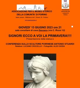 Giovedì 15 giugno nella sala del consiglio comunale di Poirino, un evento organizzato dal Museo Storico Poirinese: “Signori ecco a voi la Primavera!!!”, una conferenza di presentazione della statua di Antonio Stuardi che un anno fa il Museo ha acquisito per il Comune e che si trova da allora in mostra nella stessa sala consigliare. Un anno fa, all’epoca dell’acquisizione, Matteo Avataneo ha raccontato per il Museo la vicenda. Scrive Avataneo: ” La scultura “La Primavera”, opera del poirinese Antonio Stuardi, è ora di proprietà del Comune di Poirino. Ospitata insala consiliare è in un luogo sicuro e tutti, poirinesi e non, possono vederla ed ammirarla in tutta la sua bellezza. Grandela soddisfazione da parte del Direttivo del Museo, nonché dell’Amministrazione Comunale e, ovviamente, di tutti ipoirinesi che amano il proprio paese. Ma come è nata l’idea di acquistare la scultura e poi donarla al Comune? “A fine 2021 il Museo Storico è stato contattato da Guido Maina, di Airasca, ma originario di Poirino – spiega Sandro Crivello, presidente del Museo – ci spiegò che era venuto in possesso di un busto di una giovane donna, opera dello “scultore poirinese Antonio Stuardi, comprato in una villa di Caraglio. Ci propose di acquistarlo. Rispondemmo che eravamo certamente interessati ma non disponevamo né di denaro né di spazi opportuni. Avremmo coinvolto il Comune. Cosa che avvenne. Ci fu un incontro tra il sig. Maina, noi del Museo e l’Amministrazione comunale. Alcune difficoltà burocratiche ostacolavano l’acquisto diretto da parte del Comune. Così convenimmo di acquistarlo noi, come Museo, con un contributo del Comune, impegnandoci poi a depositare in forma permanente la scultura presso la casa comunale”.Così il Comune ha elargito un contributo di 1.800 euro a favore del Museo: “Espletate le pratiche, il 17 maggio 2022 è avvenuta l’acquisizione da parte nostra del busto e l’immediato deposito nella sala del Consiglio comunale, accanto ai dipinti del Gaidano, in luogo dotato di allarme ma accessibile al pubblico – continua Crivello – siamo soddisfatti di aver contribuito