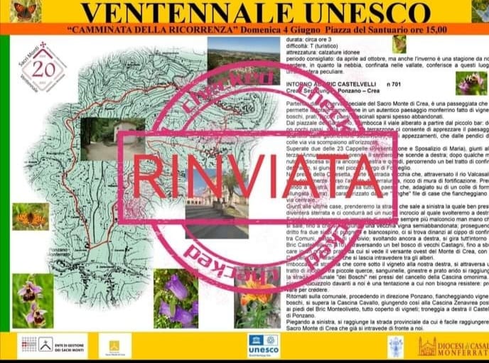 La prevista ‘Camminata della Ricorrenza” a Crea, per il Ventennale dell’UNESCO, in programma domenica 4 giugno, è stata rinviata a data da destinarsi a causa delle cattive previsioni del tempo.