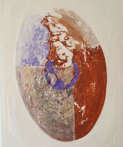 Esperienze confluite più recentemente in una profonda introspezione e forte necessità di fermare, quasi scaricare, emozioni, mistica e personalità su tela. I suoi quadri sono polimaterici, carichi di leggerezza, astrazione, figurazione e simbologia, di spunti naturali, di “oltre”.