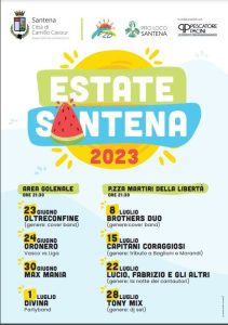 Musica, spettacoli ed eventi gratuiti allieteranno l’estate santenese anche quest’anno. L’Estate Santena 2023, organizzata dal Comune di Santena, con Santena E20 e Pro Loco Santena, renderà la Città viva e colorata grazie ai nomi di rilievo che riempiranno le serate estive. Quest’anno l’evento partirà il 23 giugno e il concerto conclusivo si terrà il 28 luglio: un mese di musica e divertimento per tutti i cittadini. Per i buongustai torna anche la festa del Frispolo e della birra in programma all’area Golenale nelle sere del 23, 24, 30 giugno e 1 luglio 2023.«I nuovi eventi musicali che abbiamo preparato per quest’estate saranno un ottimo modo per rilanciare l’estate santenese, sia per i nostri cittadini che per quelli dei paesi limitrofi» afferma Silvia Migliore, assessore con deleghe alle manifestazioni e associazioni ricreative.La serata introduttiva del 23 giugno avrà luogo all’Area Golenale alle 21:30 con la cover band Oltreconfine, seguita il 24 giugno da Oronero, cover di Vasco e Ligabue. Il 30 giugno e l’1 luglio continueranno rispettivamente Max Mania, la cover band degli 883, e la partyband Divina. Dall’8 luglio i concerti si spostano in piazza Martiri della Libertà, con la cover band Brothers Duo alle 21:30. Il 15 luglio i Capitani Coraggiosi faranno un concerto tributo a Baglioni e Morandi. Il 22 luglio Lucio, Fabrizio e gli Altri porteranno il cantautorato italiano a Santena. Infine la serata conclusiva del 28 luglio sarà animata da danze e musica dal dj set di Tony Mix.