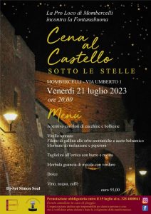 Metti una sera d’estate, un vestito elegante, in un’atmosfera coinvolgente ed esclusiva dove il Castello fa da cornice…la pro loco di Mombercelli incontra il rinomato Ristorante Fontanabuona per una cena speciale sotto le stelle…