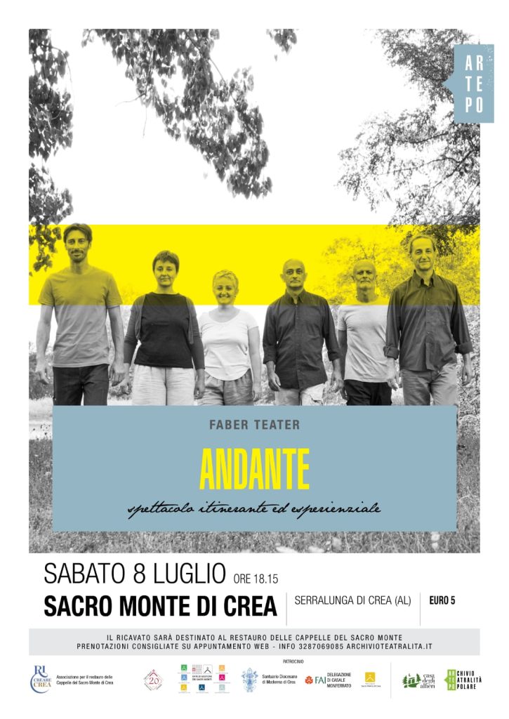 Sabato 8 luglio alle ore 18.15 “Andante” spettacolo itinerante ed esperienziale fra le cappelle del Sacro Monte di Crea a cura di Faber Teater con Francesco Micca, Marco Andorno, Lodovico Bordignon, Lucia Giordano, Paola Bordignon, Sebastiano Amadio, drammaturgia Gianluca Favetto, drammaturgia musicale e musiche originali Antonella Talamonti