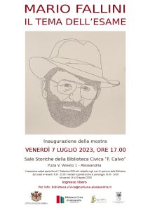 La mostra “Il tema dell’esame”di Mario Fallini sarà inaugurata venerdì 7 luglio 2023, alle ore 17, nelle Sale Storiche della Biblioteca Civica “Francesca Calvo” di Alessandria, a cura della Biblioteca Civica in collaborazione con la Società di Storia Arte e Archeologia per le province di Alessandria e Asti e l’Azienda Costruire Insieme.