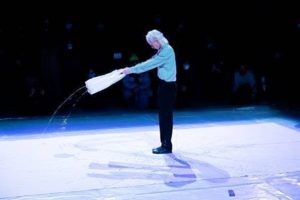 Il reenactment dell’azione performativa di Nam June Paik diventa cerimonia rituale, un gesto interpretato dalle due artiste in forma di scrittura vivente, fatta di liquidi vivi, di bioluminescenza, di corpi-batteri, di bioscritture, di tracce che talvolta, come accade con le sostanze inquinanti, tossiche e corrosive, sono destinate a permanere e a lasciare segni visibili.