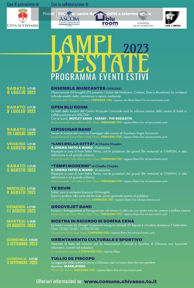 “Lampi d’Estate” è il cartellone di eventi estivi promossi a Chivasso dall’Assessorato Comunale alla Cultura. Da sabato 8 luglio al prossimo 3 settembre, musica, arte, spettacoli e manifestazioni sportive si alterneranno in città con la collaborazione di Ascom Confcommercio, Blu Room, l’associazione Gli Invaghiti e Live & Media.