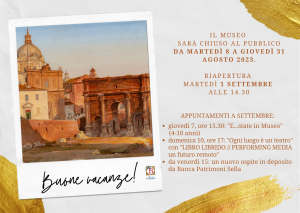 – giovedì 7 settembre, dalle 15.30, terza tappa di “E… state in Museo!”, attività con laboratorio per bambini dai 4 ai 10 anni (prenotazione obbligatoria dal 1 settembre al 389.2116858)