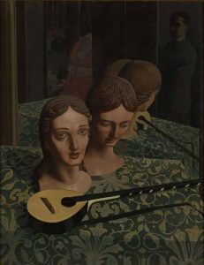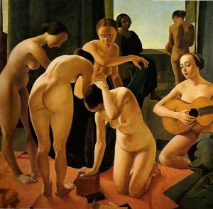 CONCERTO (1924) – Questa tela su tavola venne subito recepita dalla critica come un capitolo basilare della lettura delle cadenze casoratiane. Un gruppo di sei nudi femminili quattro in primo piano e due sullo sfondo.  “Concerto” assomiglia a una danza, dove è presente  una perfetta tensione tra  corpo e musica.. L’atmosfera è metafisica, quasi misteriosa, mentre la tavolozza è chiara, luminosa. Colui che osserva ha così modo di cogliere un’attento equilibrio tra i valori cromatici, tonali e luminosi.