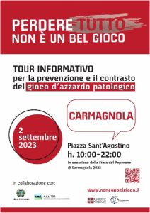 Il 2 settembre, dalle 10 alle 22 in Piazza Sant’Agostino, in collaborazione con l’ASL TO5 sarà allestito uno stand del tour informativo “Perdere tutto non è un bel gioco”, nel quale saranno distribuiti i materiali informativi e educativi delle campagne di prevenzione curate dalla Regione Piemonte e dalle locali ASL.