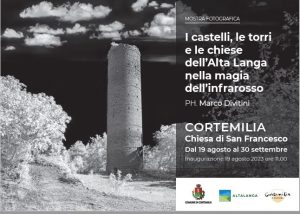 E’ stata inaugurata sabato 19 agosto, nella chiesa di San Francesco a Cortemilia, la mostra fotografica dal titolo “I castelli, le torri e le chiese dell’Alta Langa nella magia dell’infrarosso”, offrendo immagini surreali dell’Alta Langa sospesa in uno spazio e in un tempo che sembrano eterni. Un armonico insieme di scatti che, attraverso la suggestiva tecnica dell’infrarosso, guiderà i visitatori in un viaggio onirico per cogliere la bellezza autentica di castelli, torri e chiese dell’Alta Langa. La mostra sarà visitabile fino al 30 settembre c.a. .