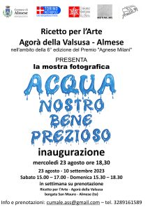 Al via la 6° edizione del Premio di Pittura “Agnese Milani”, l’Associazione Culturale Cumalè, con il patrocinio di Città Metropolitana, Unione Montana Valle Susa e Comune di Almese, promuove e valorizza attraverso l’arte la socialità, il territorio, con il progetto che ha un occhio di riguardo per Clima e Ambiente. Il tema per questa edizione è “Acqua”.
