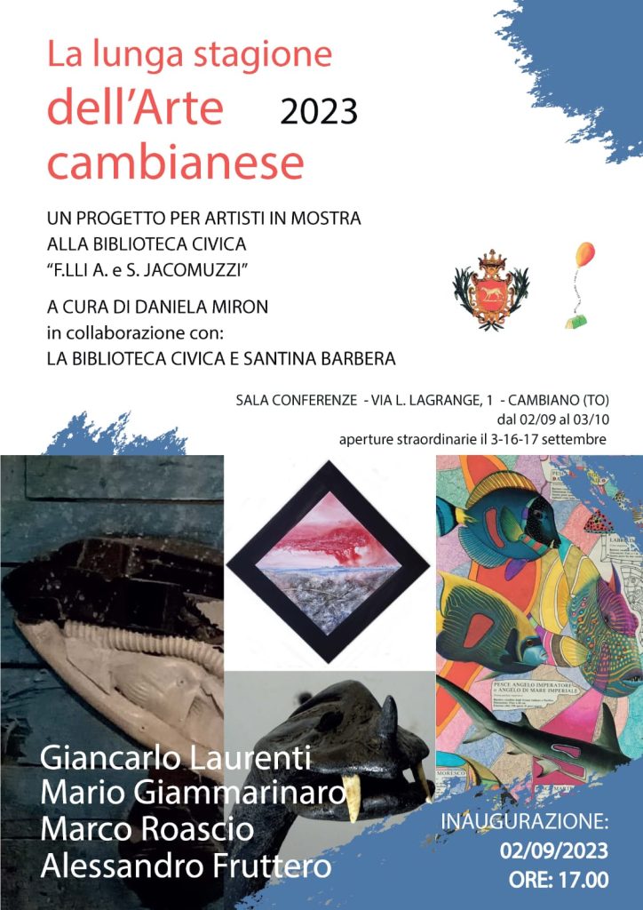 Il 2 settembre alle 17, nella Sala Conferenze della Biblioteca civica di Cambiano si inaugura la nuova mostra de «𝗟𝗮 𝗹𝘂𝗻𝗴𝗮 𝘀𝘁𝗮𝗴𝗶𝗼𝗻𝗲 𝗱𝗲𝗹𝗹’𝗮𝗿𝘁𝗲 𝗰𝗮𝗺𝗯𝗶𝗮𝗻𝗲𝘀𝗲», la rassegna di mostre d’arte a cura di Daniela Miron , in collaborazione con la Biblioteca Civica “F.lli Angelo e Stefano Jacomuzzi” e di Santina Barbera Pittrice .
