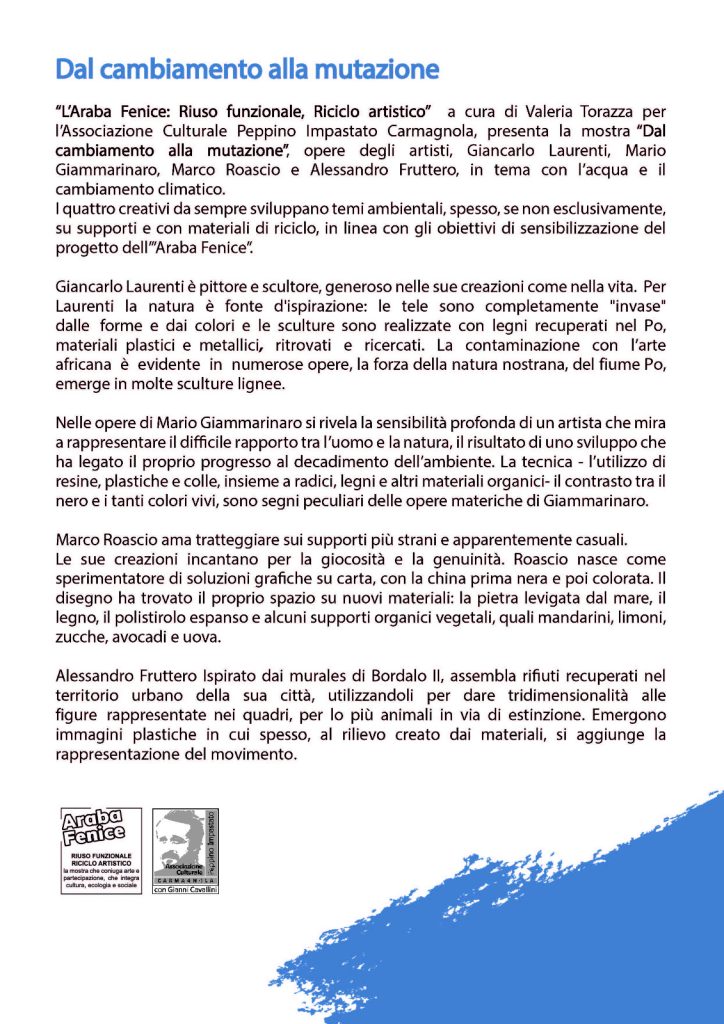 “Dal cambiamento alla mutazione” Giancarlo Laurenti , Mario Giammarinaro , Marco Roascio e Alessandro Fruttero, a cura dell’ Associazione Culturale Peppino Impastato Carmagnola- progetto Araba Fenice: Riuso Funzionale, Riciclo Artistico