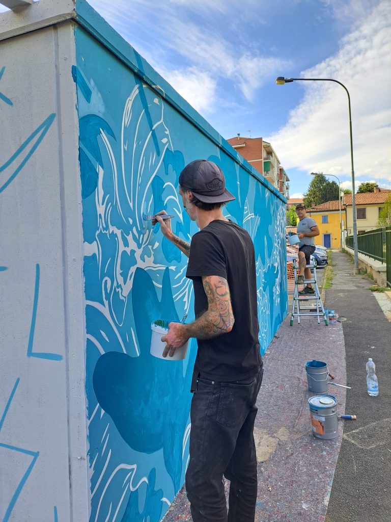 il murales dovrà essere realizzato entro il 20 settembre, data di inaugurazione del parco PATCH. Spesa complessiva per i murales: 5620 euro. Nelle foto: l’artista al lavoro