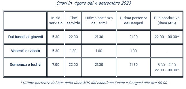 Con la riapertura della Metropolitana sarà rispettato il precedente orario studiato per il proseguimento dei lavori e la manutenzione ordinaria della linea, ovvero: dal lunedì al giovedì e nelle giornate festive, dalle ore 22:00 a fine servizio, la gestione avverrà con i bus sostitutivi della linea M1S (riportiamo tabella oraria).