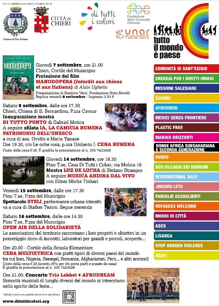 Pino Torinese. Le date del Festival “Tutto il Mondo è Paese” in settembre di Redazione · 9 Settembre 2023 Maggiori informazioni sul sito: www.dituttiicolori.org/ Visto da: 221