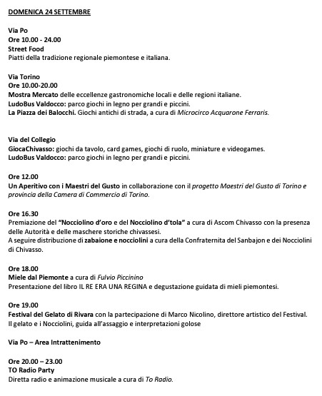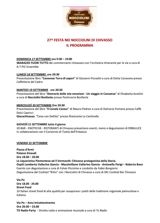 Il programma parte con un’anteprima domenica 17 settembre all’insegna del commercio: oltre 40 commercianti danno vita allo “Sbarazzo-Fuori tutto” accompagnato dalla musica dalla banda itinerante. Da lunedì 18 a giovedì 21 si susseguono eventi di avvicinamento in un crescendo di attività culturali ed enogastronomiche per arrivare al cuore della festa da venerdì 22 a domenica 24, e concludere con la consegna del Nocciolino d’Oro e il Nocciolino d’Tola rispettivamente alla storica negoziante Silvana Ceresa Carladami e all’artista Nino Ventura, che con la sua arte ha contribuito a portare il nome di Chivasso nel mondo.