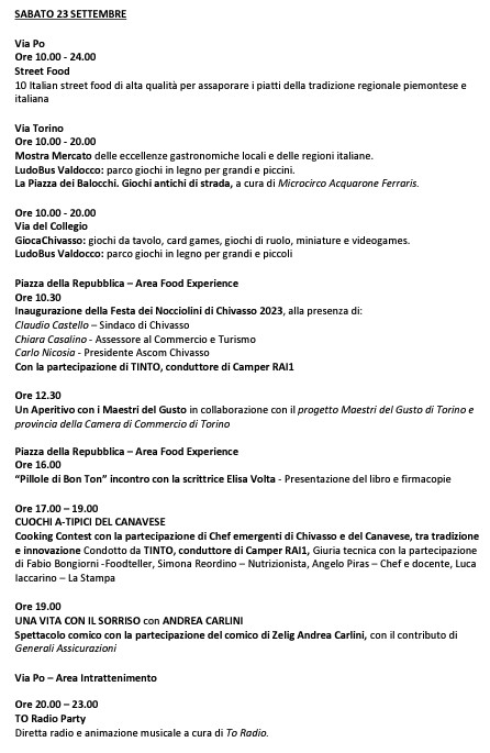 Sabato 23 settembre il presentatore TINTO, anche quest’anno in giro per l’Italia per la trasmissione “Camper” su RAI1, accompagnerà la giornata, attraverso l’inaugurazione ufficiale, e nel pomeriggio con il concorso “Cuochi A-tipici del Canavese” che vedrà cimentarsi giovani ma affermati chef del territorio. Il comico di Zelig Andrea Carlini si esibirà nel pomeriggio, seguito da incontri del foodteller Fabio Bongiorni con i Maestri del Gusto di Torino per tutto il weekend.