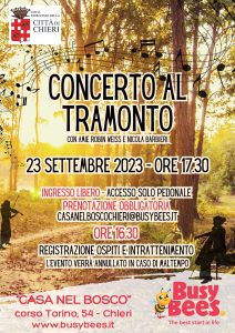 Busy Bees, con il patrocinio della città di Chieri, ha il piacere di invitare la cittadinanza nel parco privato della scuola dell’infanzia, Casa nel Bosco, per condividere con i bambini e le loro famiglie un momento sereno fatto di musica, natura ed emozioni indimenticabili.