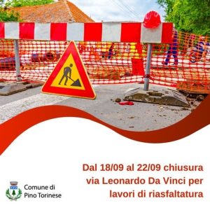 Si comunica che dal giorno 18/09 al giorno 22/09, dalle ore 8,00 alle ore 17,30 circa, verrà chiusa alla circolazione la Via Leonardo da Vinci per i lavori di riasfaltatura.